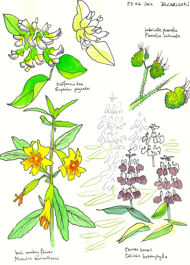 In May, I enjoyed new blooms, still-green hills, and the cool shade along the Homestead Trail. Caterpillars were everywhere, a white-lined sphinx moth caterpillar (Hyles lineata) below, along with lupine seed pods and wild cucumber fruits: