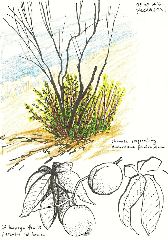 At the end of September, summer was officially over, but summer weather here lasts well into fall. Chamise regrowth was strong and healthy, and the buckeye leaves were brown and ready to fall, revealing the fruits: