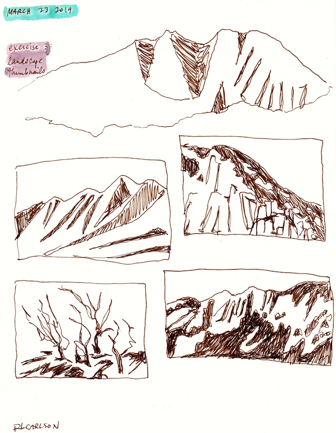 Exercise 3: Landscape Thumbnails – Simplify landscape views into areas of light and dark. Look for larger-scale patterns: where are trees or shrubs growing on a hillside, how do shadows define ridges and valleys, how do dark and light change as you look even further into the distance?