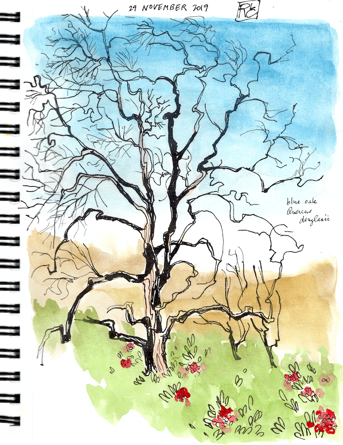 I hiked up the trail toward Blue Ridge and stopped to draw a diagram (across a full spread, here in the pages above ∧ and below ∨) showing the zones of grassland (south-facing slopes) and chaparral (north-facing slopes) on Pleasants Ridge. I also noted seed pods of bush monkeyflower, reminding me a bit of corn still wrapped in dried husks. Hummingbirds caught my attention repeatedly, several times perching in trees near enough that I could watch their movements.