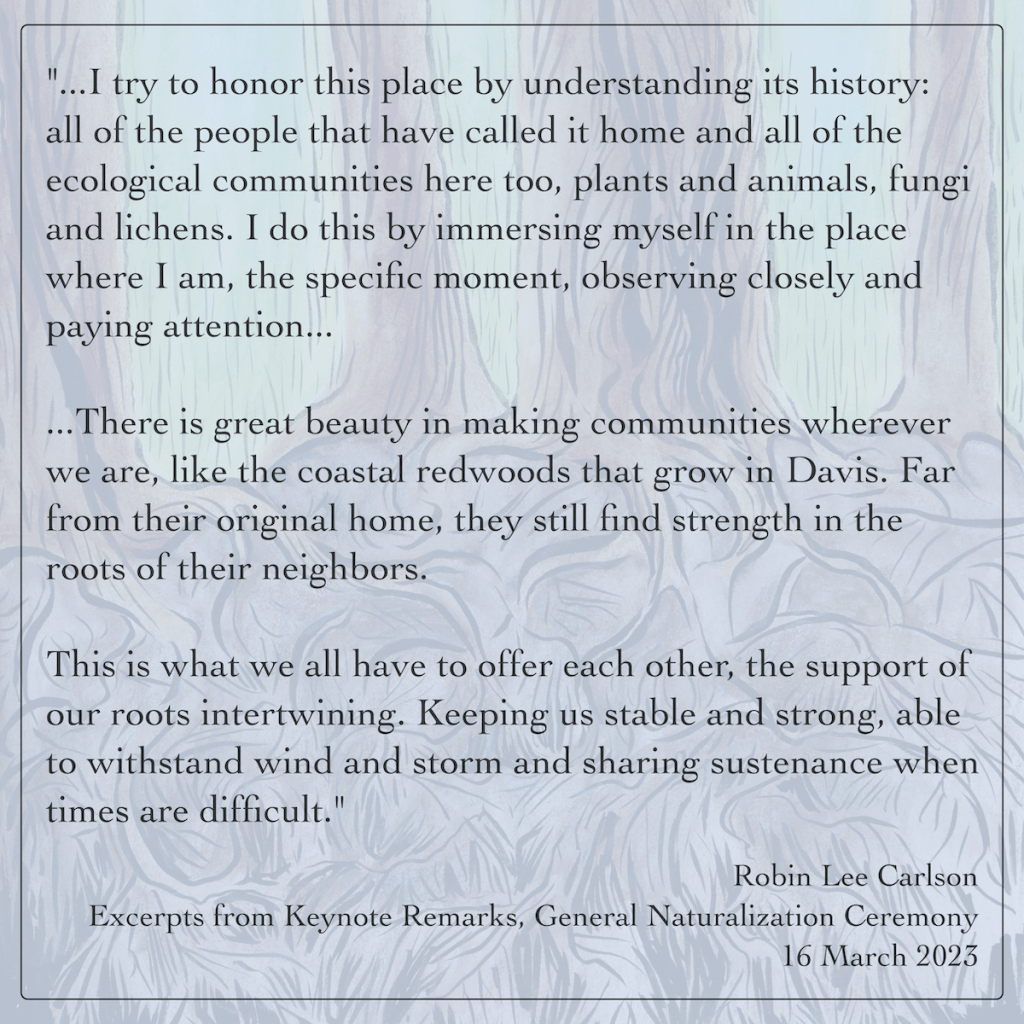 There is great beauty in making communities wherever we are, like the coastal redwoods that grow in Davis. Far from their original home, they still find strength in the roots of their neighbors.