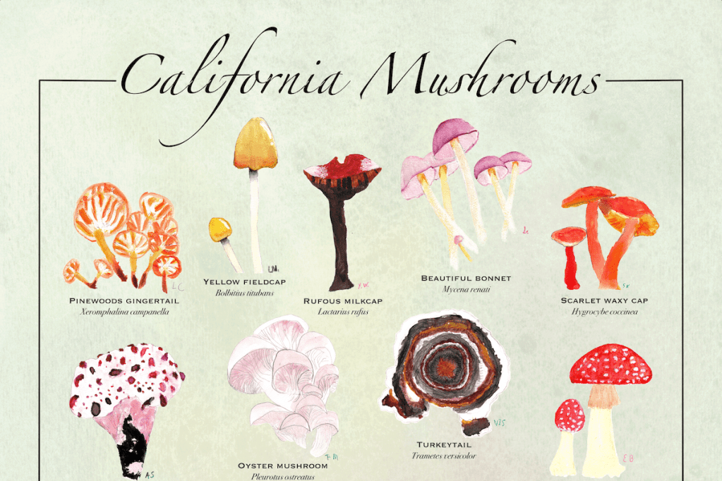 One of our projects has been a detailed study of a mushroom found in California, and I turned the students’ gorgeous final mushroom watercolors into an 18” x 24” poster that we are selling to raise funds for their school in its annual auction. I am so impressed by the work they have been doing in both art and ecology!