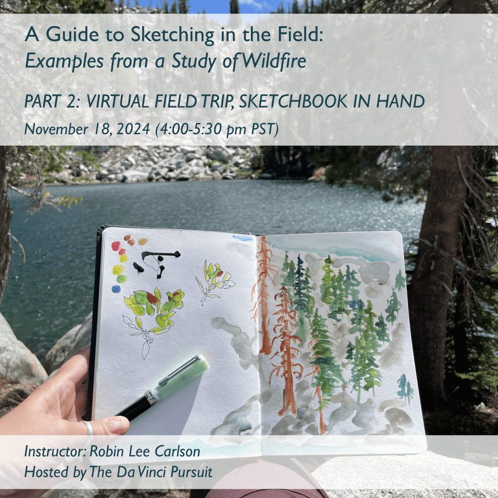 Back home after a hike with a sketchbook full of drawings, what comes next? Field sketches can stand on their own as documentation of what we observed. They can also be springboards into further explorations of a place or process, or invitations to more involved artworks. In the final workshop of the series, we will talk about ways to keep engaging with your field observations: ways to identify new species encountered, how to investigate questions that arose, and ideas for expanding one set of observations into a larger project. I will share examples from my wildfire sketchbooks, and lead participatory demonstrations of some of the work I have done to develop field sketches into artworks that tell a story that emerges over time.
