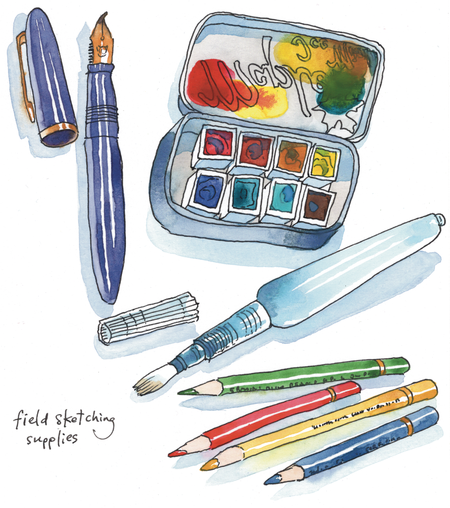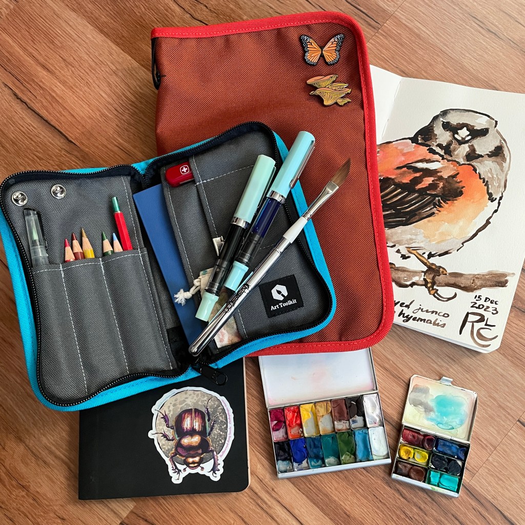 I travel light in the field and am almost never carrying more than a pen or two and either a waterbrush and small paint palette or a handful of colored pencils.
